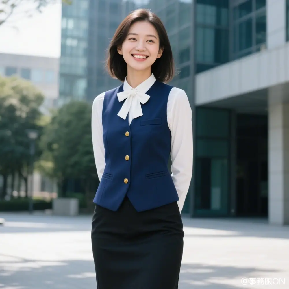 紺の三つボタンのベストに、白のブラウス、黒のスカートを組み合わせた事務服の中では定番のスタイルですが、ベストとスカートを違う色で合わせることで、全体的にオシャレなシルエットに仕上がっています。