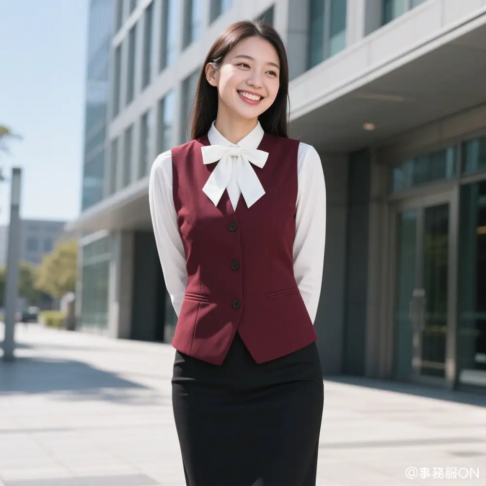 赤の三つボタンのベストに、白のブラウス、黒のスカートを組み合わせた事務服の中では定番のスタイルですが、ベストとスカートを違う色で合わせることで、全体的にオシャレなシルエットに仕上がっています。
