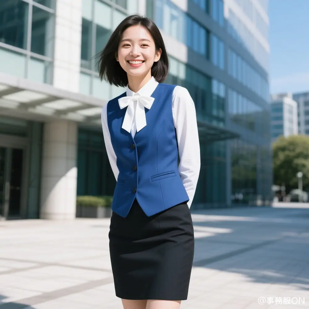 青の三つボタンのベストに、白のブラウス、黒のスカートを組み合わせた事務服の中では定番のスタイルですが、ベストとスカートを違う色で合わせることで、全体的にオシャレなシルエットに仕上がっています。