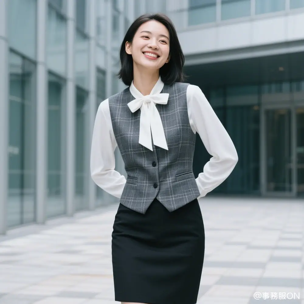 チェック柄のグレーの三つボタンのベストに、白のブラウス、黒のスカートを組み合わせた事務服の中では定番のスタイルですが、ベストとスカートを違う色で合わせることで、全体的にオシャレなシルエットに仕上がっています。