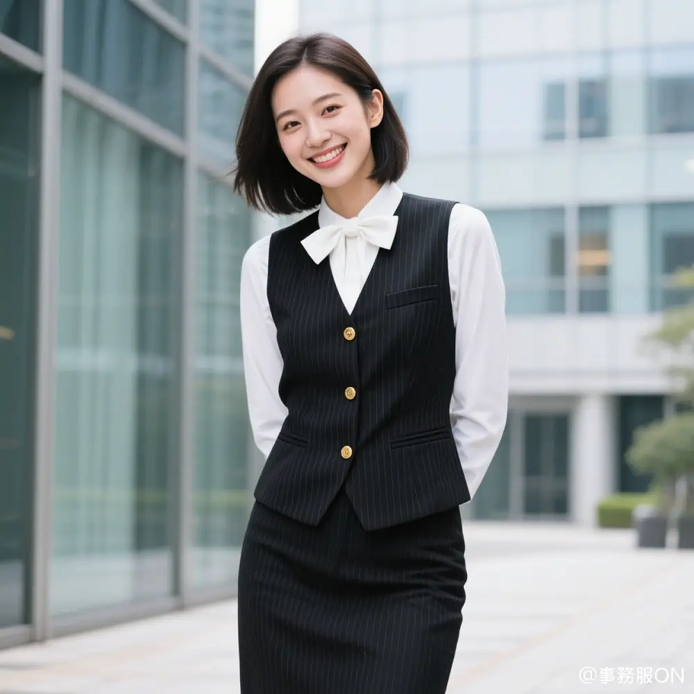 ストライプ柄の黒の三つボタンのベストに、白のブラウス、ストライプ柄の黒のスカートを組み合わせた事務服の中では定番のスタイルですが、シンプルなストライプ柄がちょっとしたアクセントになっており、全体的に落ち着いたシルエットに仕上がっています。